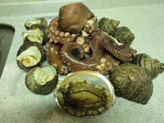 高級食材頂きました。沖の島のチョウでかいタコY君より。アワビとサザエN先生より。これでビールがすすみますわ!!