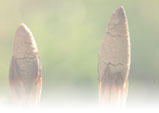 | バックホーで、スチール製供給コンベアに廃材を投入。 | 粉砕された廃材がチップとなって供給される。 |